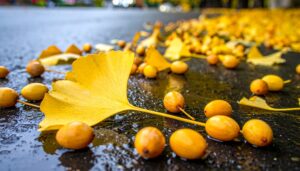 特徴・見分け方: 秋に黄色く色づく街路樹。地面に落ちた独特の臭いがある「実」に注意。